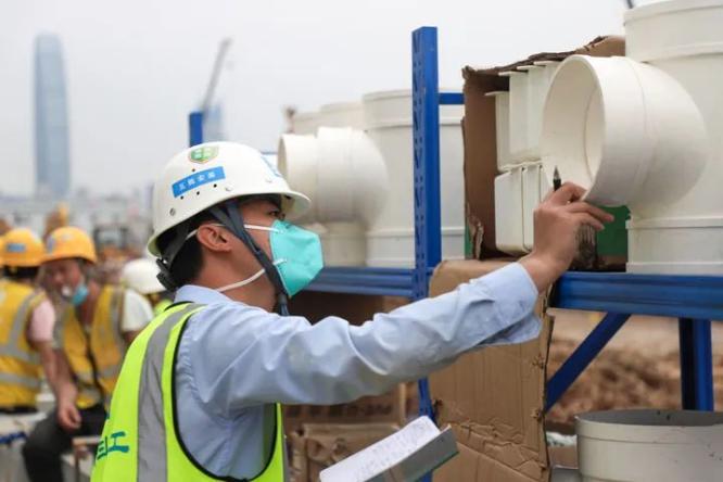▲4月2日,一期医院A3工区长刘胜强在施工现场。“我是1997年出生的,和香港也是有缘,听说有援港项目我就报名参加。”负责现场物资管理的于喆和材料挤在一个帐篷,忙的时候每天只有3个小时睡眠。在他管理的仓库,管材和阀门码得整整齐齐,标签妥帖地指示着材料特征。