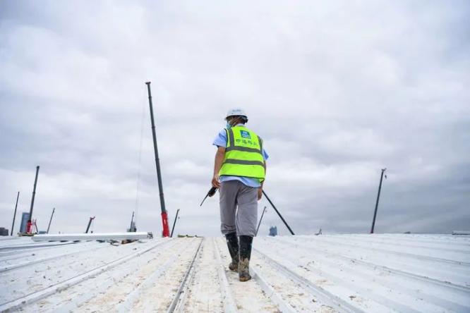 ▲3月27日,一期医院A1工区长李增源在屋顶上察看施工情况。原标题:《抢建“生命之舟”!中央援港应急医院背后的央企建设者故事》