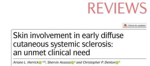 [1] Herrick AL, Assassi S, Denton CP. Skin involvement in early diffuse cutaneous systemic sclerosis: an unmet clinical need [published online ahead of print, 2022 Mar 15]. Nat Rev Rheumatol. 2022;1-10. doi:10.1038/s41584-022-00765-9