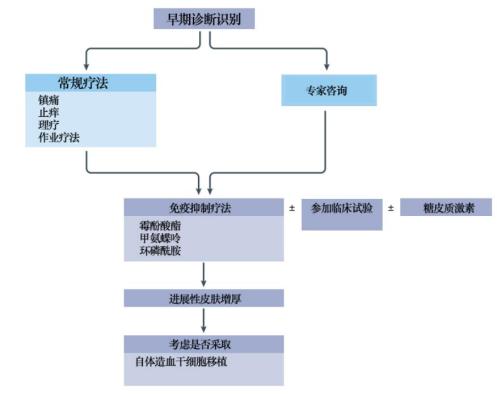 尽管目前SSc无法治愈,但现实推着临床工作者不断往前走,最重要的就是优化疾病管理策略,尤其是对皮肤受累进展的患者进行对症治疗、免疫抑制治疗或HSCT治疗。早期dcSSc中皮肤增厚的患者中,较优的管理模式如图3所示。