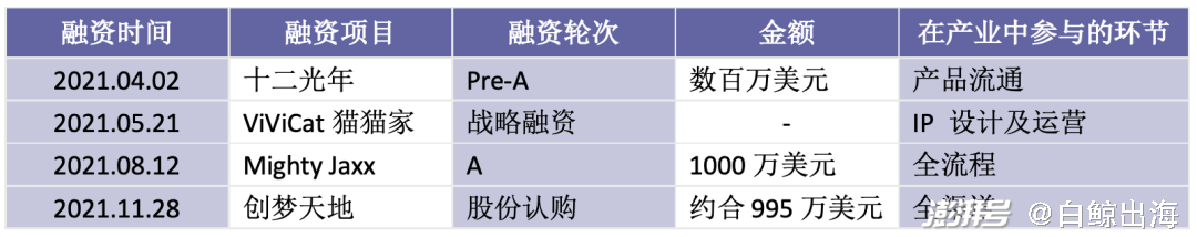 一年 3 次 A 轮融资,腾讯及其 IP 合作方分批入场如上文所述,3 月 28 日,潮玩品牌「Mighty Jaxx」完成了 3 月以来的第二次融资(A 轮第 3 次),据 36Kr 消息,本轮投资方为创梦天地与一家拥有丰富 IP 资源的技术公司。在此之前的 3 月 7 日,「Mighty Jaxx」刚刚获得了 2000 万美元投资,领投的是关注东南亚及日本市场的早期创投基金 East Ventures,其他投资方还有来自韩国的 Korea Investment Partners、来自美国的 Greycroft 等。