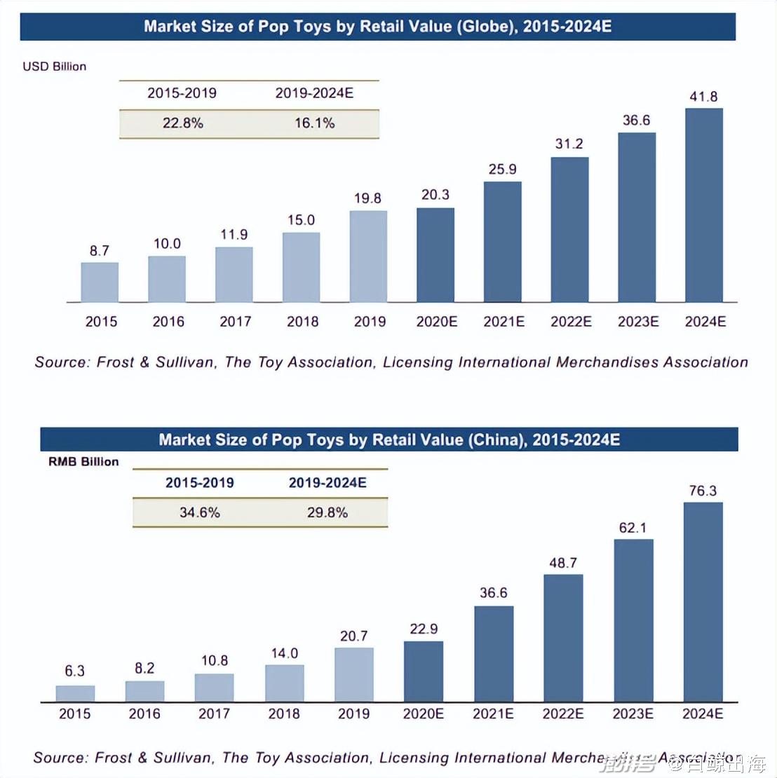 美国咨询公司 Frost & Sullivan 在 2019 年 12 月进行的调研结果显示,全球潮玩市场 2019-2024 年的年复合增长率为 16.1%。相比之下,中国市场的增速更快,2019-2024 年的年复合增长率将达到 29.8%,高于全球平均水平。