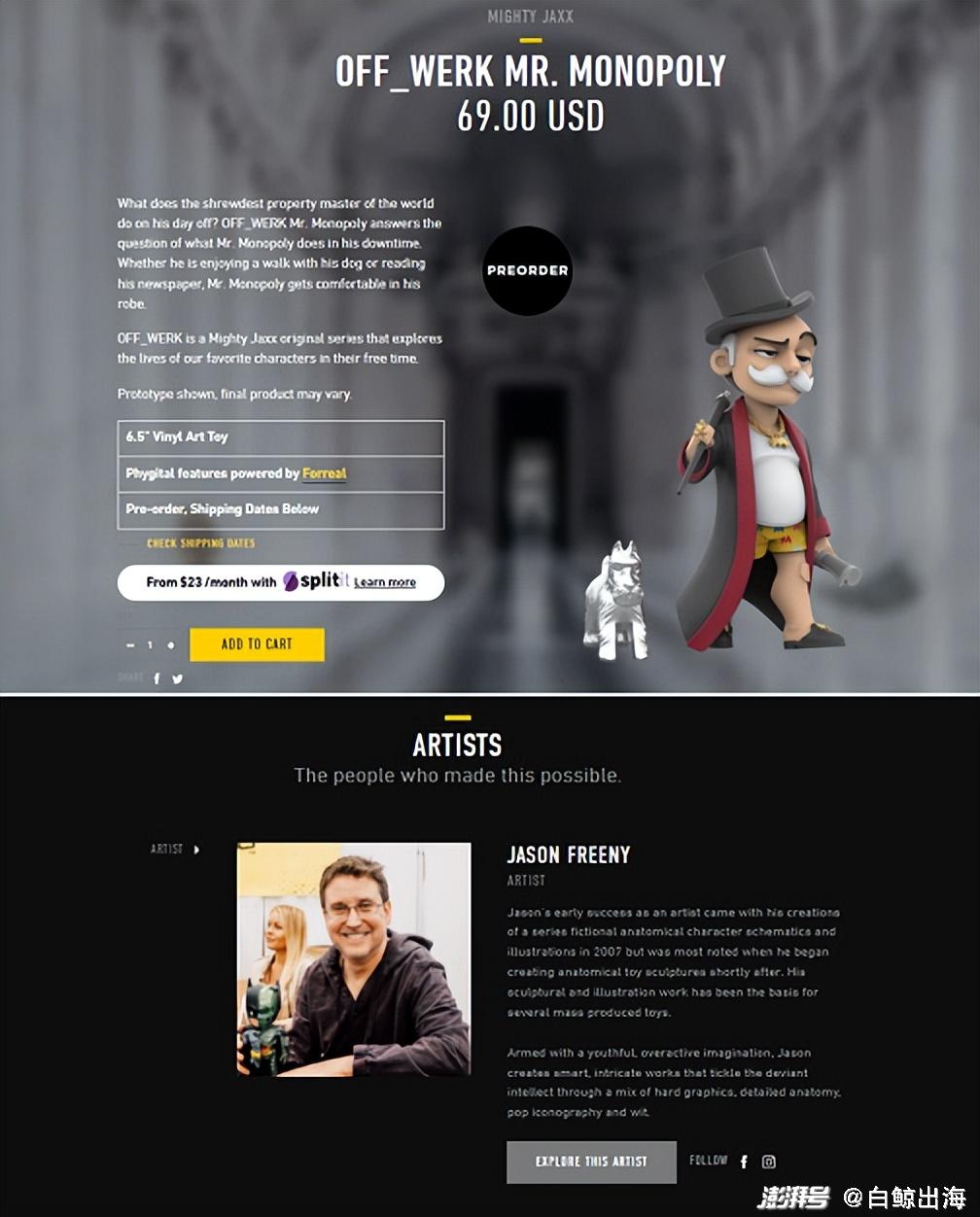 「Mighty Jaxx」的产品详情页会较为详细地介绍产品,包括 IP 形象背景及来源、产品材质及尺寸,除此之外,如果设计者是独立艺术家,官网也会附上独立艺术家的简介,以及个人网站或社媒账号。
