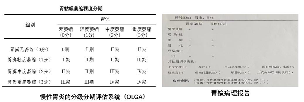 怎么判断萎缩性胃炎的程度及风险?多处活检结果结合内镜来评估萎缩的范围和程度,分为无、轻、中、重度等4个等级。萎缩程度以固有腺体减少各1/3来计算,轻度(+):固有腺体数量减少不超过原有腺体的1/3;中度(++):固有腺体数量减少介于原有腺体的1/3-2/3;重度(+++):固有腺体数量减少超过2/3,仅残留少量腺体,甚至可以完全消失。慢性胃炎分级分期评价系统(OLGA)将萎缩性胃炎分为0~Ⅳ期,其中Ⅲ期和Ⅳ期发展为胃癌的风险性更大。发生胃癌的风险主要根据萎缩的范围、程度、幽门螺旋杆菌感染状况、年龄、胃癌家族史进行综合判断。