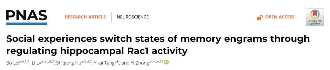 近日,清华大学生命科学学院钟毅课题组在《美国国家科学院院刊》(PNAS)上发表了题为:Social experiences switch states of memory engrams through regulating hippocampal Rac1 activity(社交经历通过调节海马Rac1活性来转换记忆痕迹的状态)的研究论文。