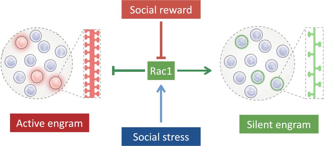 研究团队聚焦海马体CA1区的记忆痕迹细胞与情绪状态的关系,发现了社交经历引发的情绪可以双向调节记忆痕迹的存储状态,如社交奖励可以将记忆痕迹由沉默态转换为潜伏态,而社交压力可以将记忆痕迹由潜伏态转换为静默态。通过对海马Rac1活性的检测与操纵,我们证明了社交奖励通过抑制海马Rac1、社交压力通过激活海马Rac1来实现记忆痕迹在不同状态之间的转换。如图1所示,该研究提供了一个全新的神经生物学机制来帮助我们理解日常的情绪变化是如何通过切换海马体中的记忆痕迹状态来根据环境变化灵活调节记忆提取的。