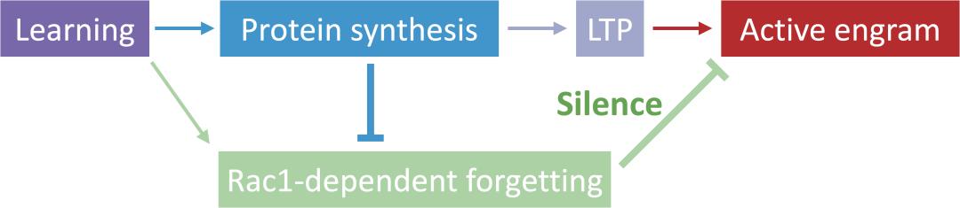 图1. 情绪经历调节记忆痕迹细胞状态的神经机制该研究也暗示了在经典的长期记忆形成过程中蛋白质合成所介导的固化过程和Rac1活性介导的主动遗忘过程是一个统一交互的过程。如图2所示,学习会同时引发蛋白质合成介导的记忆固化过程以实现形成激活态的记忆痕迹细胞,同时学习还会激活Rac1依赖的主动遗忘过程来驱使记忆转换为静默态。通常的有效学习中,蛋白质合成介导的固化过程同时会产生对记忆遗忘的抑制,来保证记忆的提取并使记忆可以稳定维持。而这种动态的记忆与遗忘的平衡过程最终赋予了动物可以根据实际面对的场景来灵活地双向调节记忆的提取效率的能力,从而更好地面对复杂多变的环境。