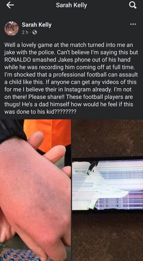 这样的比赛结果,让球迷不满,也让以C罗为首的曼联球员们难以平静。赛后,曼联球员没有鼓掌致谢客场球迷,而是径直从球员通道离开。然而就在曼联球员离开赛场的路上,一名埃弗顿小球迷伸出手拍摄C罗。随后不久一名自称是这名埃弗顿小球迷母亲的网友,在社交媒体上发帖痛斥C罗,称C罗在离开球员通道时,愤怒地砸碎了自家孩子的手机,并且怒斥C罗身为人父却如此对待一个孩童。并且,她的孩子患有孤独症和运动障碍,这次是小朋友第一次去现场看球。