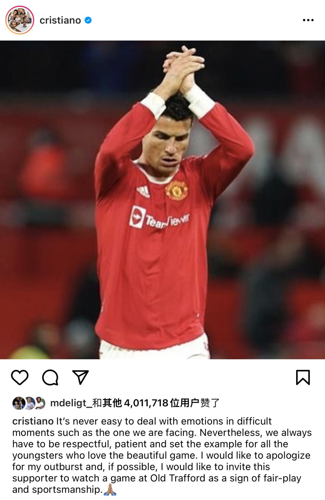 事后,C罗表示了道歉并说明确有此事发生,并且邀请这对母子前往老特拉福德球场看球,以示公平竞争和体育精神。