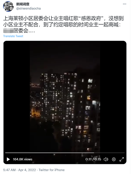 近日,国内外社交平台上流传一段15秒左右的视频,据称是防疫期间,上海莱顿小区居委会组织业主唱红歌“感恩政府”,没想到小区业主不配合,到了约定唱歌的时间齐声叱骂居委会。