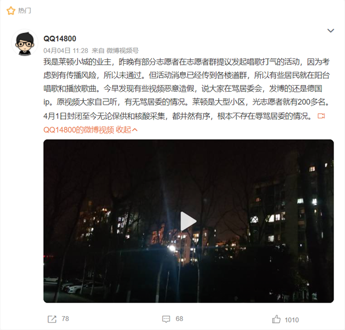 “莱顿小城”业主发布的辟谣微博,附上了4月3日晚8点“唱红歌”时的真实录像。“因为没有组织,大家是各唱各的。”