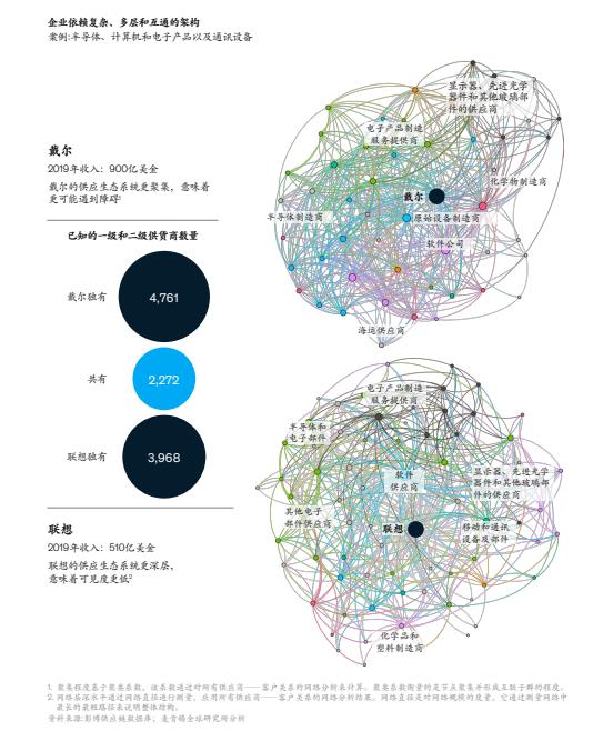 第二,需要以阴阳平衡的思路改善供应链生态系统结构。和传统西方哲学提倡的“非此即彼”逻辑不同,阴阳平衡的思路体现了中国道家思想,阴阳元素既相互对立,又相互依存,体现了万物间的相生相克。如图,麦肯锡的研究报告将联想和戴尔两家进行对比。此图表示即使是在同一行业内,企业也可能在如何构建其供应生态系统方面做出差别很大的决定,且各有其风险。戴尔的供应链生态系统更聚集,意味着更容易遇到障碍。联想的供应链生态系统更深层,意味着可见度更低。所以,我们认为在构建供应链生态系统从思维方式就需要彻底改变。和西方亚里士多德“非此即彼”的哲学逻辑不同,我们更认为阴阳平衡的思维方式打造的全球供应链更具韧性。