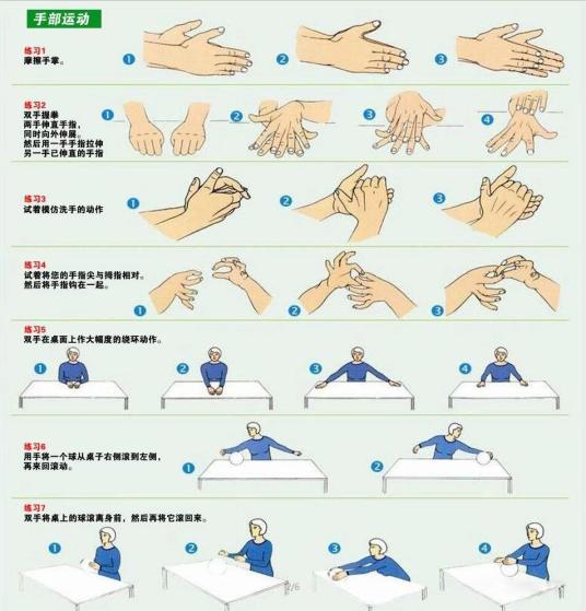 2.锻炼双手:经常伸直手掌,用一只手抓住另一只手的手指向手背方向施压,以防关节畸形;还可以反复练习手指分开、合并、握拳动作。
