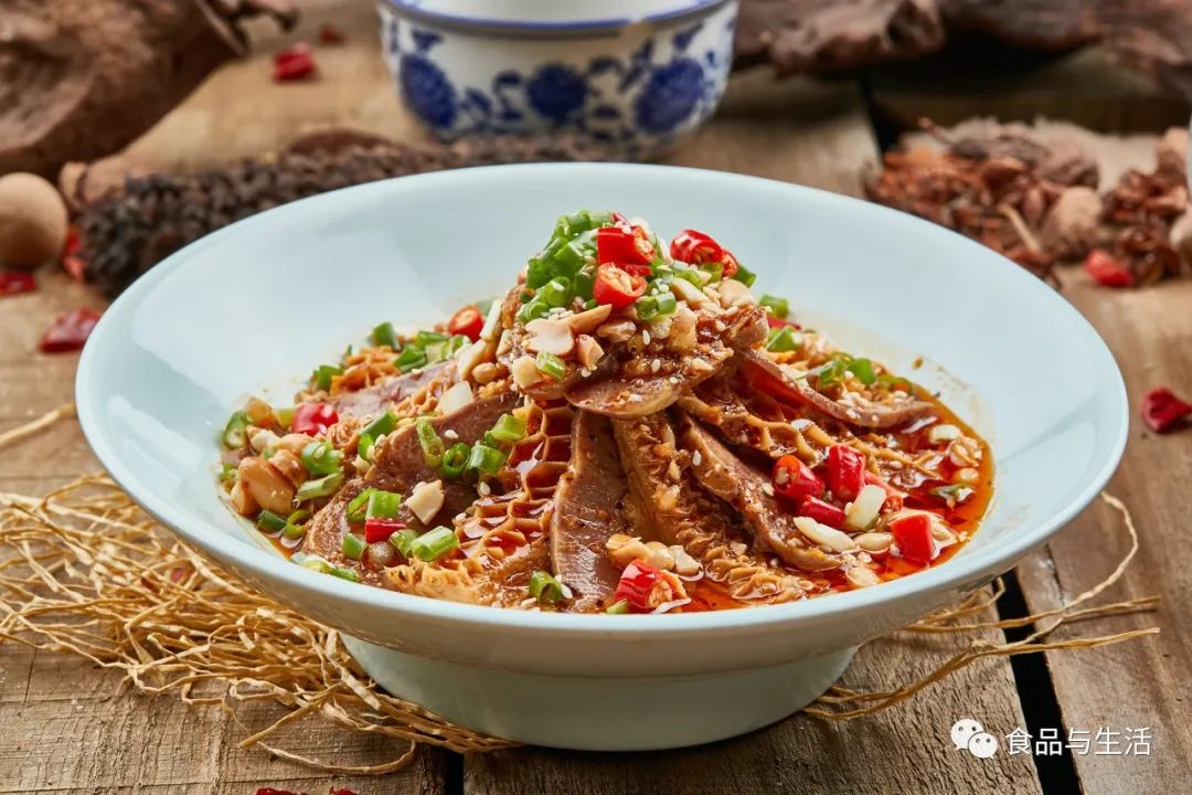 红油金钱捞肚 这是一道凉菜,色泽红亮,嚼劲足,鲜辣味浓又爆汁。制作相对简便,只需将清洗干净、煮熟的金钱肚切丝,加入盐、糖、鸡精、陈醋、红油、芝麻油、芥末油、切好的蒜末,拌匀,即成。