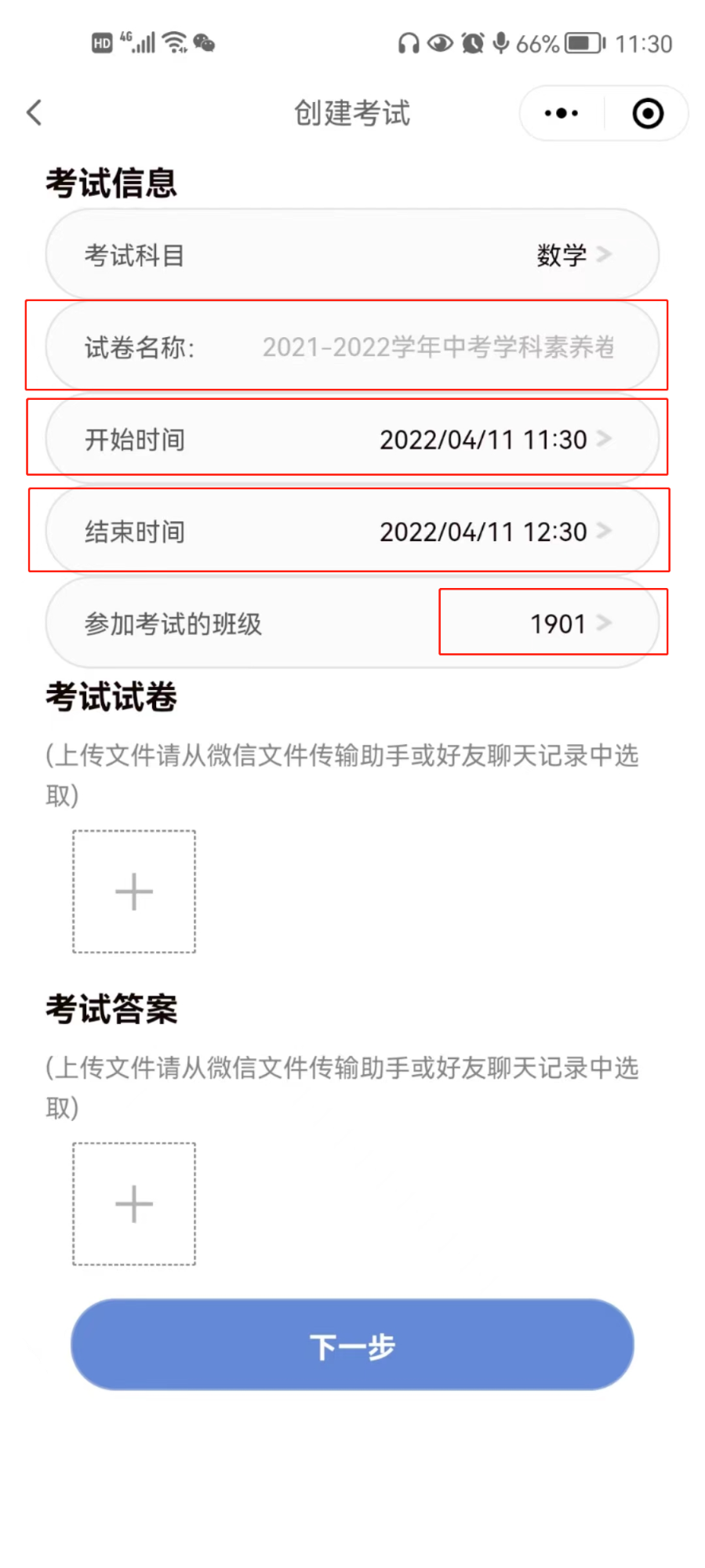 1. 设置试卷参数①选择考试科目、填写试卷名称、选择考试班级、选择考试开始和结束时间
