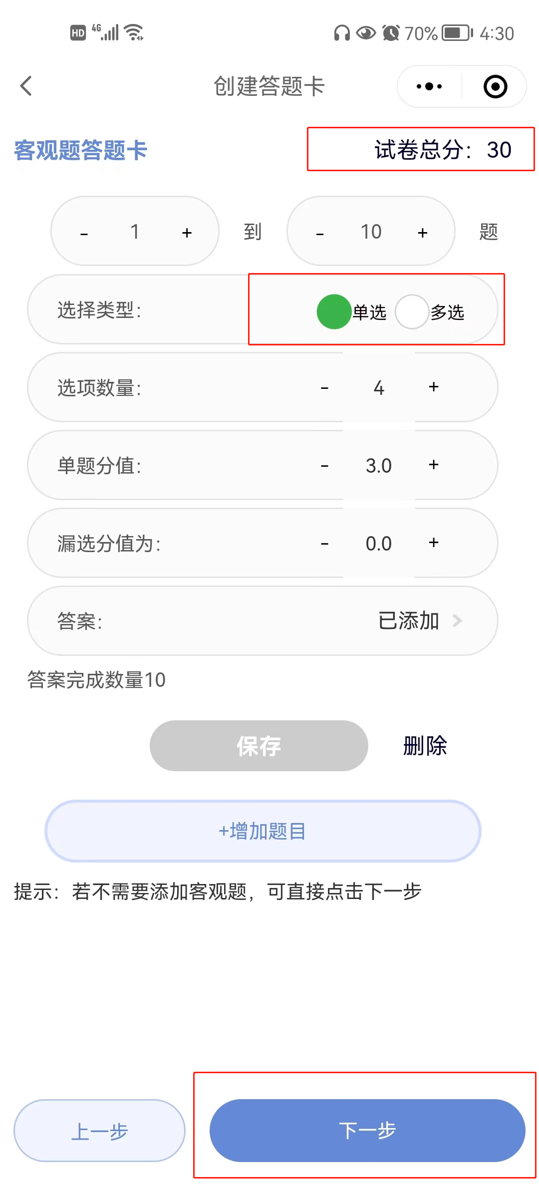 v 支持单选、多选等类型,学生提交试卷后,系统自动评阅,节省教师阅卷时间。