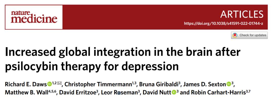 2022年4月11日,伦敦帝国理工学院的研究人员在国际顶尖医学期刊 Nature Medcine 上发表了题为:Increased global integration in the brain after psilocybin therapy for depression 的研究论文。