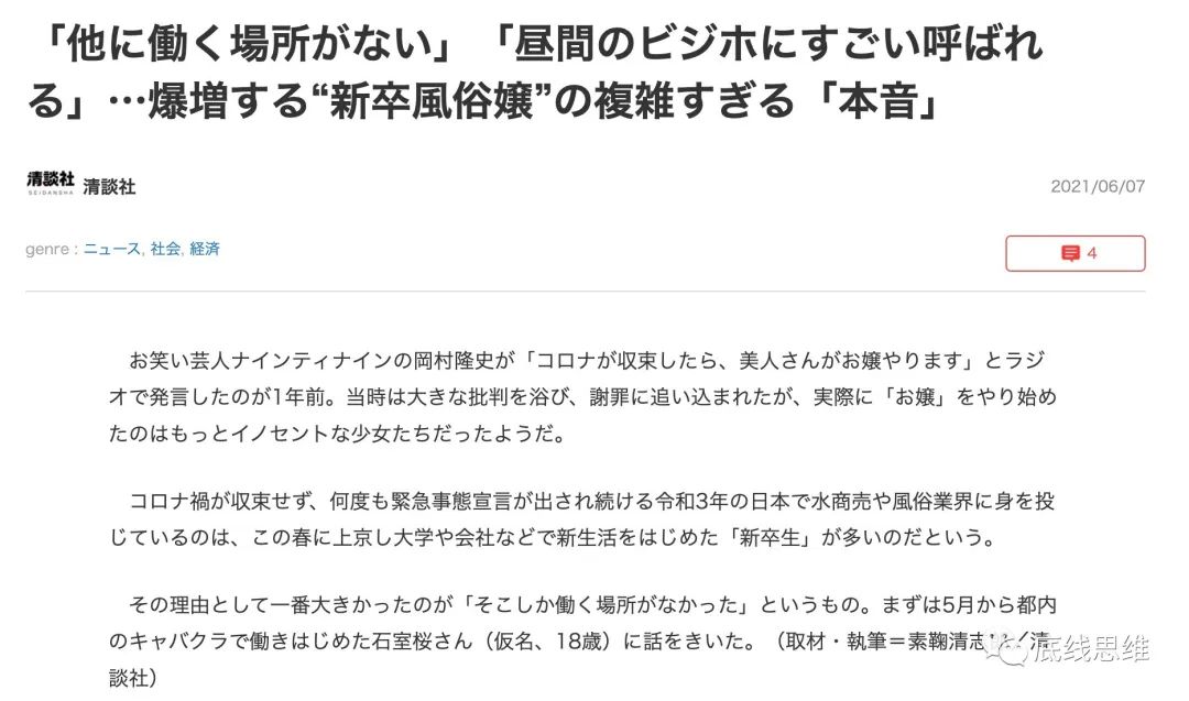 这对相关行业而言无疑是一种新的“内卷”,只要能让更年轻的女孩子出演,那高概率就能更好地吸金,从而开出更好的薪资来吸引女孩。在日本目前的社会现状下,唾手可得的工作机会和高额报酬,恐怕会让很多女生落入魔窟。