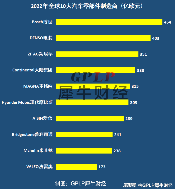 2022年全球10大汽车零部件制造商(注:榜单金额以欧元计算,其中欧元兑美金汇率为1: 1.15; 欧元兑日元1: 130.6;欧元兑韩币1: 1348。)