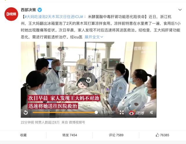 可惜就是最近,浙江一位王女士因为食用凉拌木耳进了医院ICU,因为她的木耳在冰箱里泡了两天,引发了食物中毒,导致她的肝肾功能恶化衰竭,险些丧命……