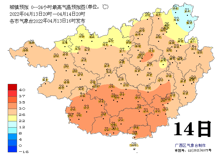 广西气象台13日17时发布预报: