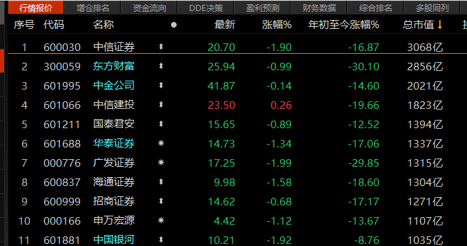 在整体市场低迷状态下,券商概念股低迷,券商概念指数年内跌幅超过17%。当前市值超过1000亿元的券商概念个股共计11只,年内股价均表现不佳,累计跌幅不一。