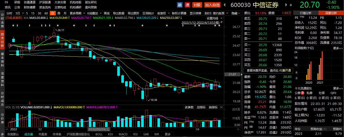 4月12日晚,“券商龙头”中信证券首发今年一季度业绩快报,营收同比有所下滑,归母净利润同比微增。今日该股股价伴随着大盘下行而走低,最后收跌1.9%报20.7元/股。