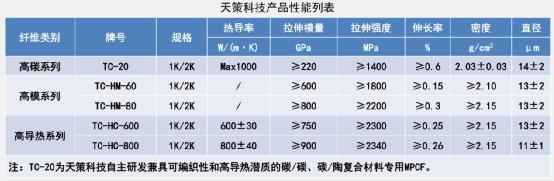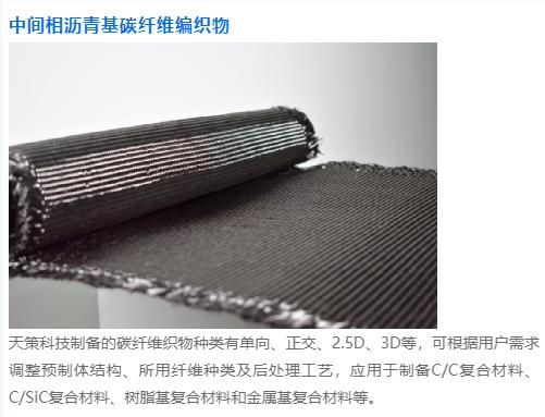 天策科技现已形成了高碳系列、高模系列、高导热系列等系列产品型号。另外,针对产品应用工艺研究,进行了单向、正交、2.5D、3D碳纤维织物的制备工艺及石墨化工艺研究,根据客户需求进行了多种型号织物的制备探索,进行了短切纤维、预浸料、树脂基复材以及碳/碳、碳陶复材等下游应用工艺性的开发。