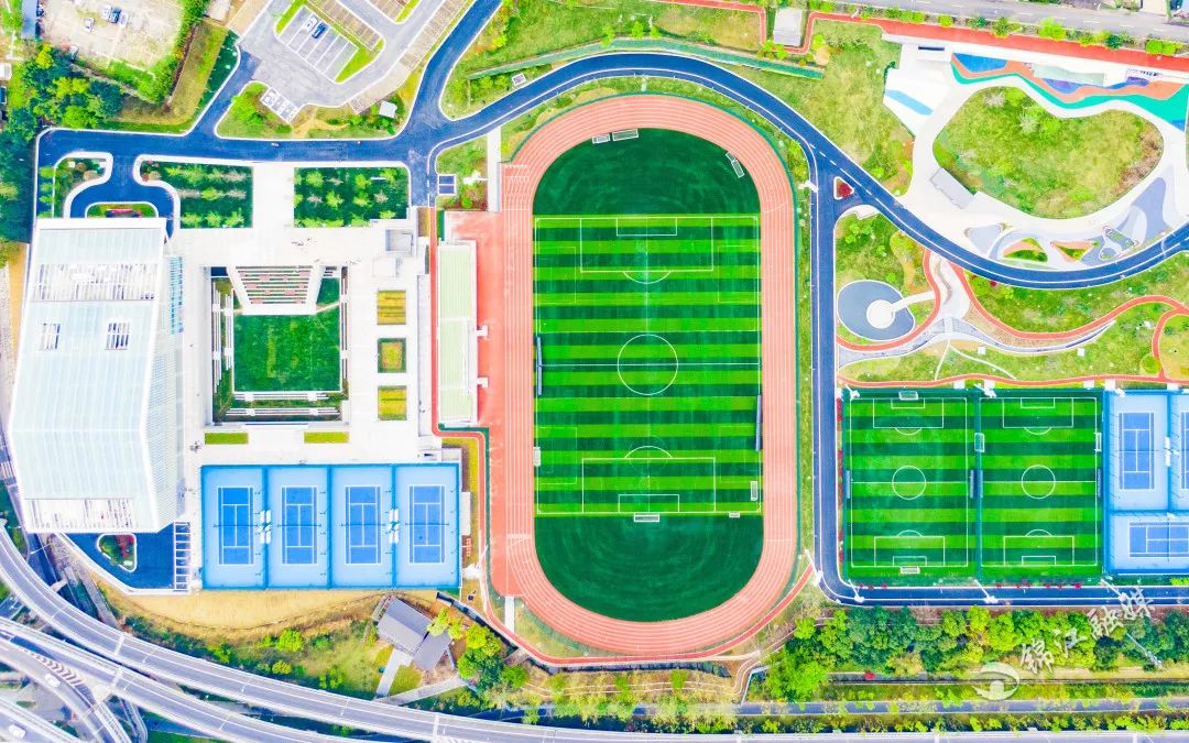 △空中鸟瞰锦江体育公园室外部分包含1个11人制足球场、2个7人制足球场、7个标准网球场、400米标准跑道。