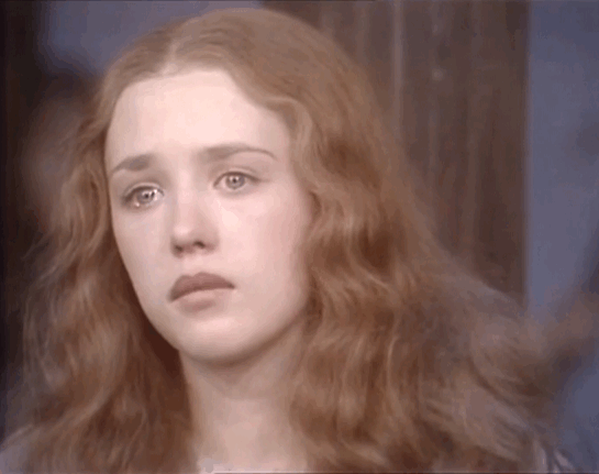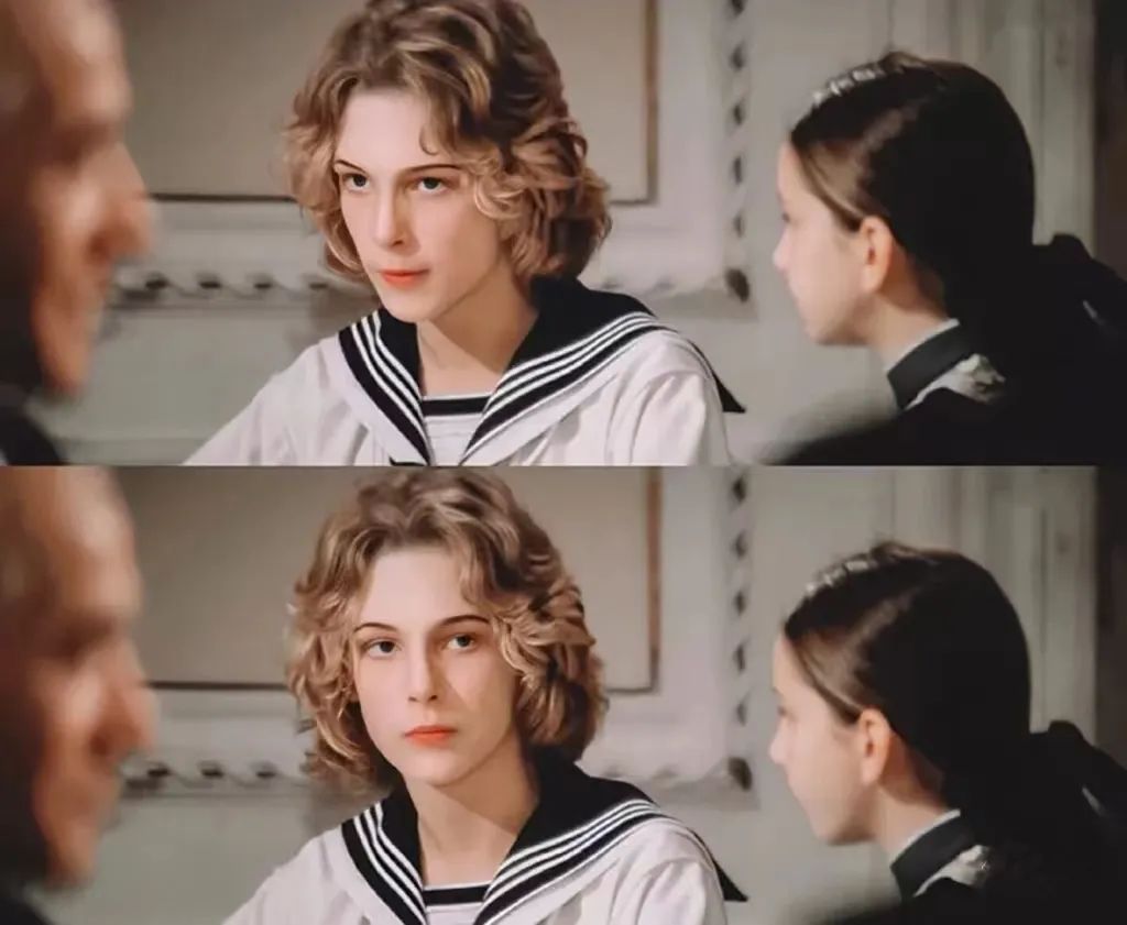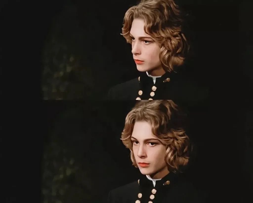 苍白又立体的面庞被蜂蜜色鬓发环绕,鼻子挺直,唇形可爱。