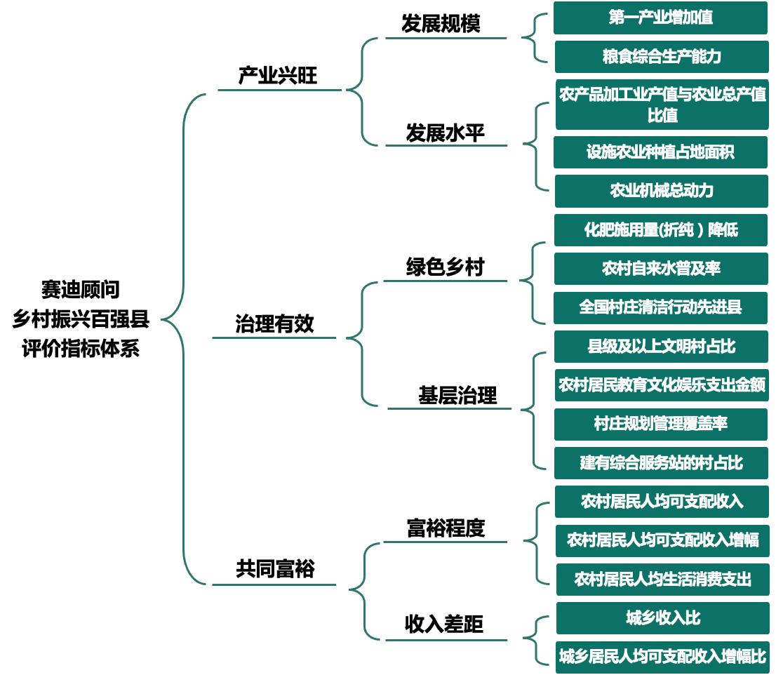 赛迪顾问县域经济研究中心围绕实施乡村振兴战略,落实产业兴旺、生态宜居、乡风文明、治理有效、生活富裕的总要求,结合新时代“三农”工作特点,从产业兴旺、治理有效、共同富裕三大维度构建乡村振兴百强县评价指标体系,包括一级指标3个,二级指标6个,三级指标17个,对1869个县级行政区的经济和社会综合发展进行全面评价与分析。
