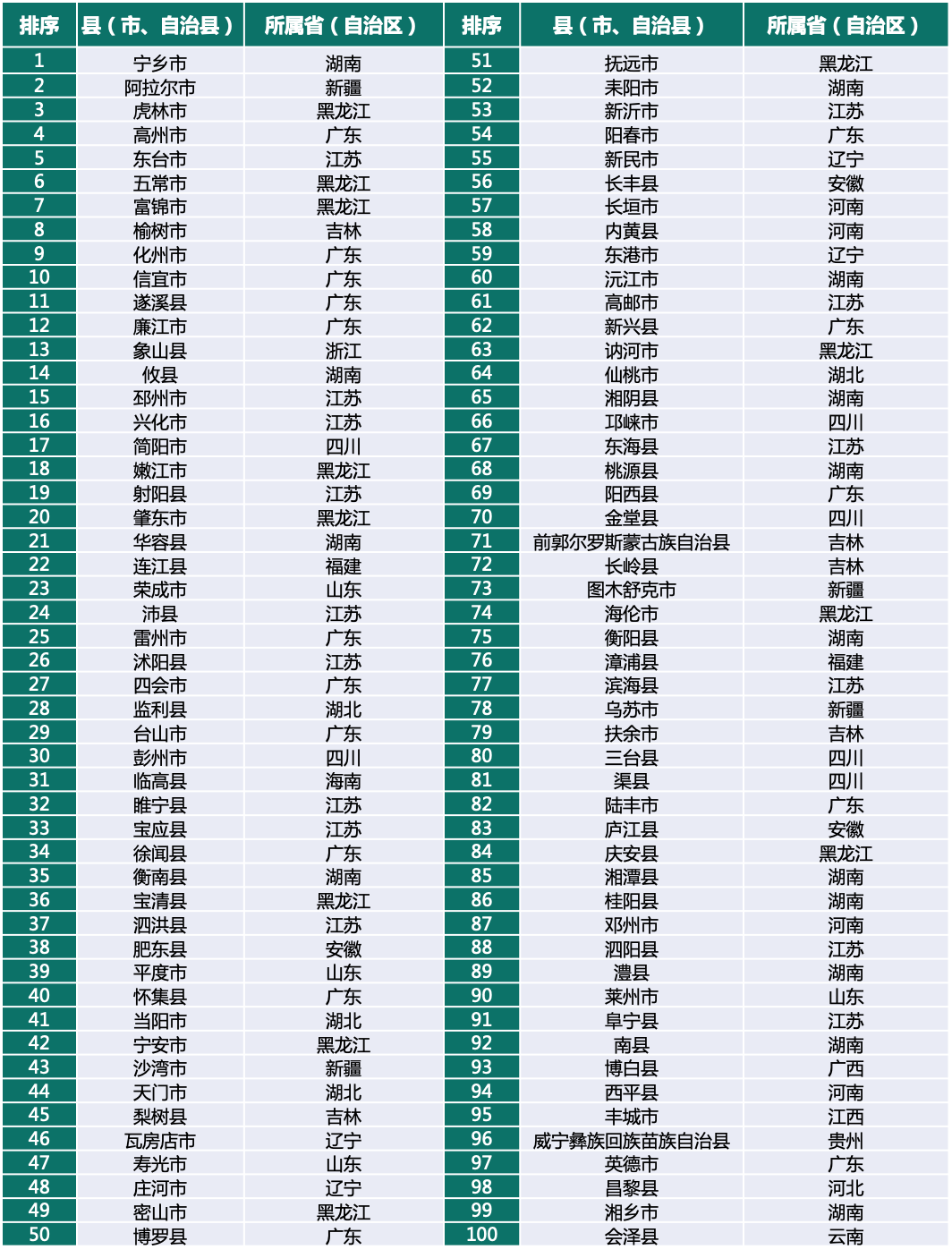 榜单从位次分布看,12省(区)覆盖全部位次段,头部县(市)引领优势明显。广东、江苏、湖南、黑龙江、四川、吉林、河南、湖北、辽宁、山东、新疆、安徽等12省(区)覆盖全部10个位次段,分布相对集中。