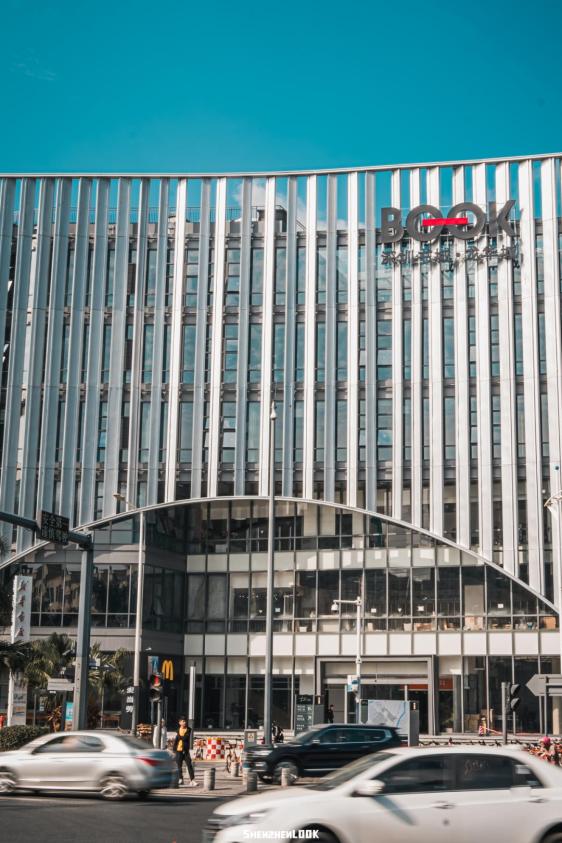 龙华书城,坐落在龙华文化中轴上,由香港汇创国际建筑设计团队打造。书城远观是八面体多边形结构,近看如翻开的书页。不同方位倾斜的金属外板,可根据太阳的不同角度调节温度摄入。