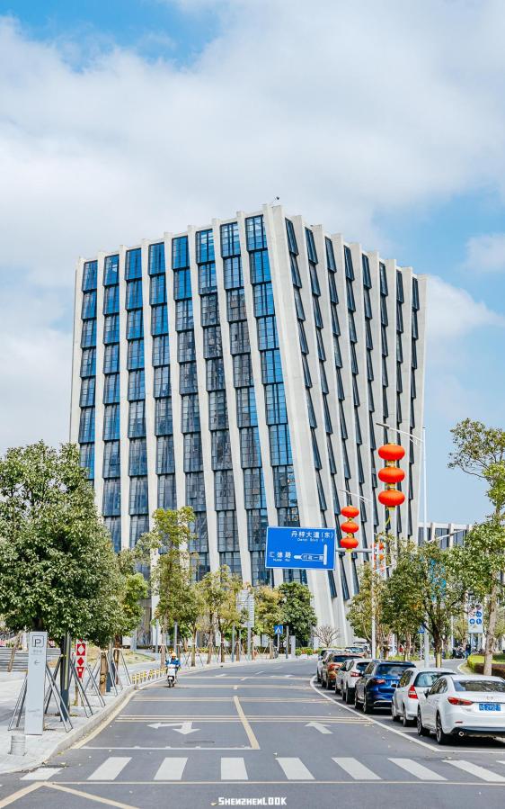 建筑整体采用精湛古法设计及工艺,由纯白方块堆叠拼接,形成一个“回”字型的山水庭院。该建筑荣获中国钢结构金奖。四面挑高的建筑独立成栋,通过连廊穿插连接,充满岭南民居叠院风格。