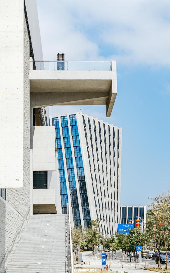 灰色的外墙大量采用灰混凝土设计,简约大气柱体倾斜而上,如“被扭动的麻条”