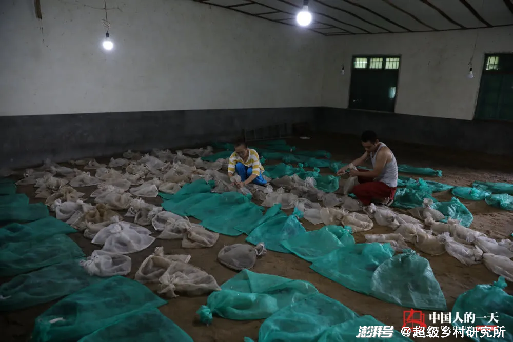 村中的某个蛇房里,每个网袋中都盘着好几条蛇,房间里有差不多一万多条赤链蛇。 图源/腾讯 中国人的一天