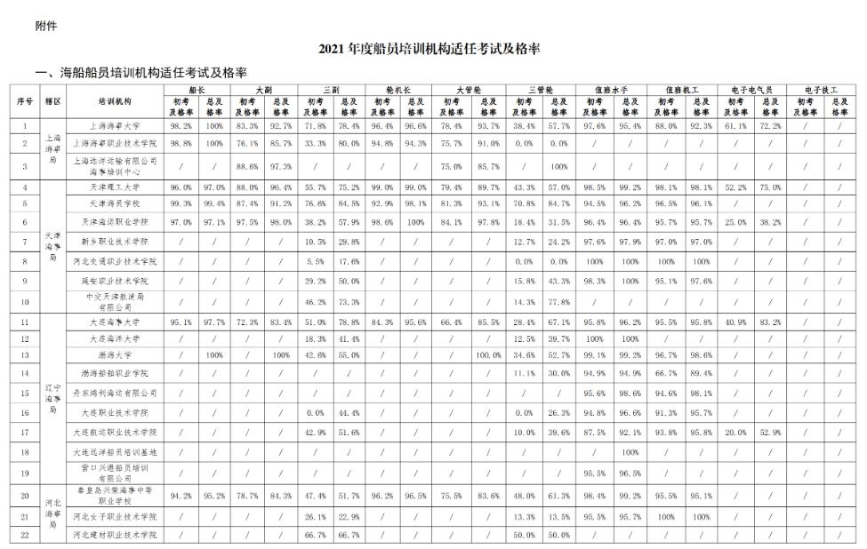 根据《中华人民共和国船员培训管理规则》(交通运输部令 2019年第5号)的规定,现将2021年度船员培训机构适任考试及格率予以公布。