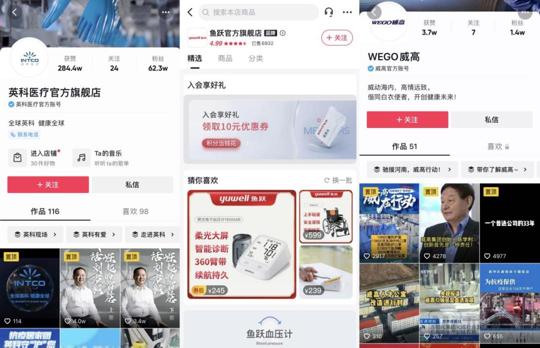 可见,在多个平台进行多渠道布局成为了医疗器械企业们的共同打法,这也使得它们对新平台的放开政策格外敏感,以求提前卡位。比如在抖音端,截止目前,已入驻企业就包括了鱼跃医疗、英科医疗、瑞思迈、欧姆龙、威高等在内的数十家医疗器械商。