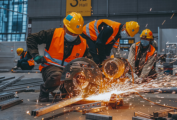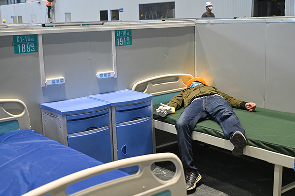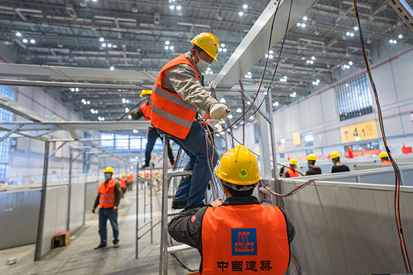 施工最难的不是工艺,而是时间。国家会展中心方舱医院要求三天左右完工,工作量大,基本上没怎么睡觉,熬通宵地干。有时刚想眯一会儿,事情又来了。实在撑不住,就找个靠墙能坐的地方,头靠在膝盖上休息会儿。吃饭也是现场分发,随便找个位置扒拉几口。
