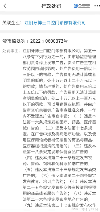 2022年4月6日,牙博士旗下江阴牙博士口腔门诊部有限公司因涉嫌违反《中华人民共和国广告法》第五十八条规定,被立案调查。企查查显示,该起违法违规共涉及14项之多。最终,牙博士被江阴市市场监督管理局罚款30万元。