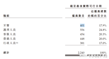 难以想象的是,牙博士的牙医比营销人员少。截至最后报告期内,公司的牙医只有401名,甚至少于客服人员454名与营销人员448名。