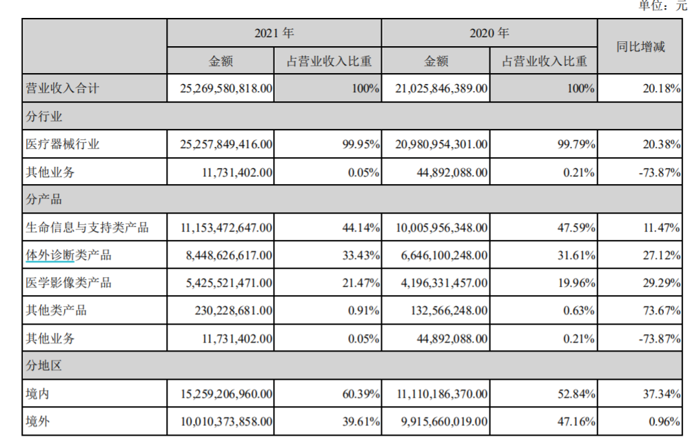迈瑞医疗分产品、分地区的2021年业绩表现
