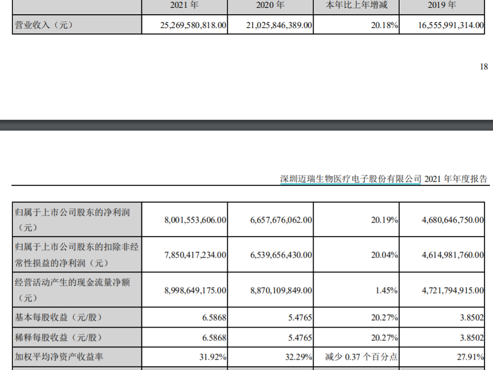 4月19日晚间,深圳迈瑞生物医疗电子股份有限公司(迈瑞医疗,300760)公布2021年报,显示去年营业收入252.7亿元,同比(较上年同期)增长20.18%;归母净利润80.02亿元,同比增长20.19%;归母扣非净利润78.5亿元,同比增长20.04%。