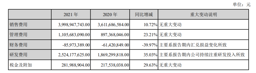 迈瑞医疗2021年主要财务数据