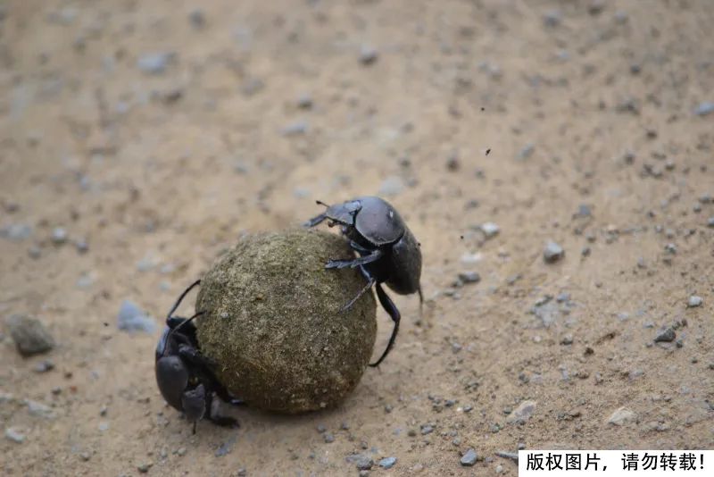 求偶:当雌屎壳郎看到雄屎壳郎在推粪球时会对其表现得十分崇拜,于是雌屎壳郎就会帮雄屎壳郎一起推粪球,最终可能会一起繁衍后代。