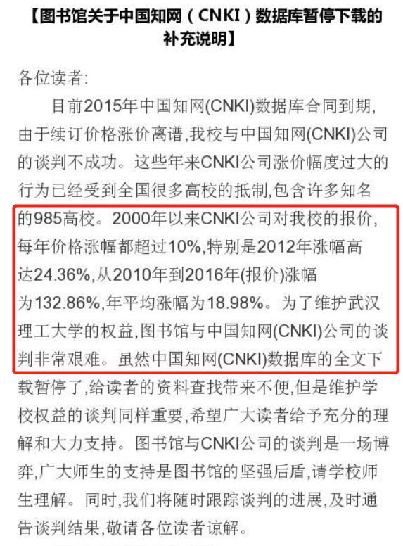 2016年1月,武汉理工大学图书馆发布公告,直言知网“涨价离谱”,还提供了数据佐证。公告提到,2000年以来,同方知网对该校的报价每年涨幅都超过10%,从2010年到2016年的涨幅为132.86%,年平均涨幅18.98%。公告中还坦言,“为了维护武汉理工大学的权益,图书馆与中国知网的谈判非常艰难。”