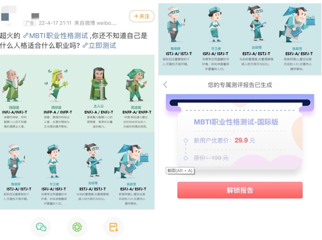 MBTI测试推广链接,需要付费才能解锁报告。(手机截图)