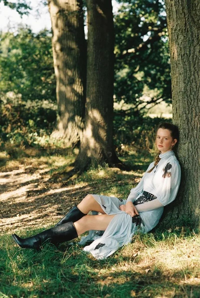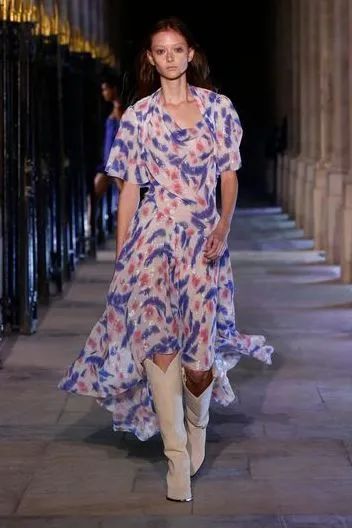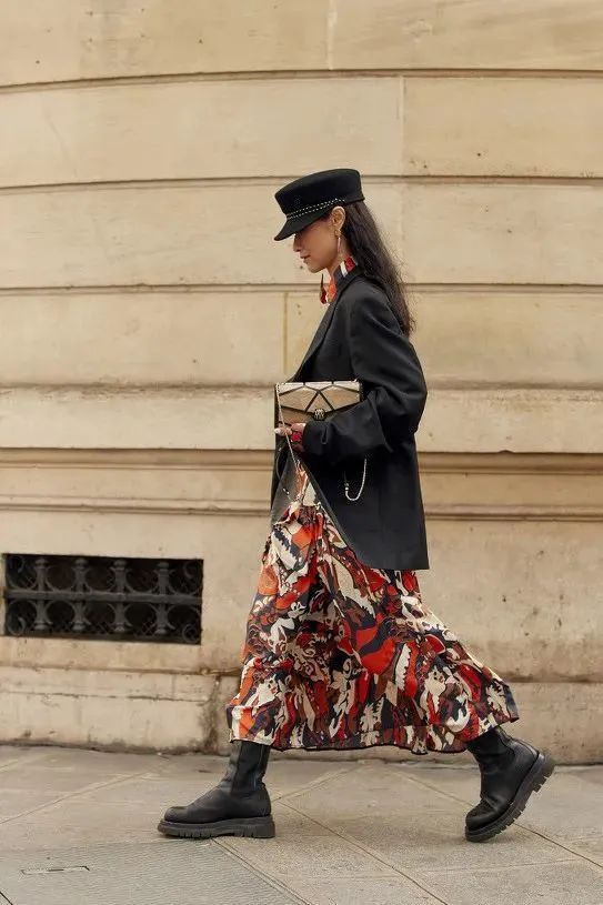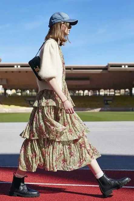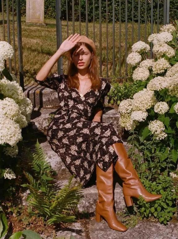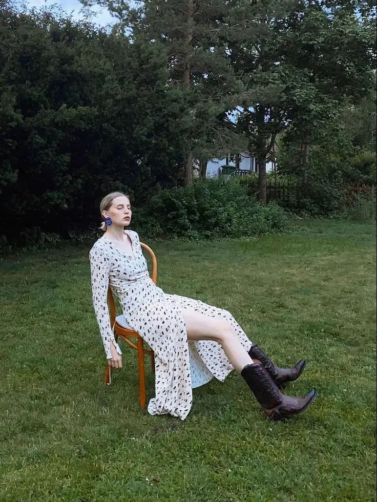 小小的碎花有了开叉样式的加持,灵动且颇具女人味,配上西部靴,像这样的混搭也出乎意料的好看!