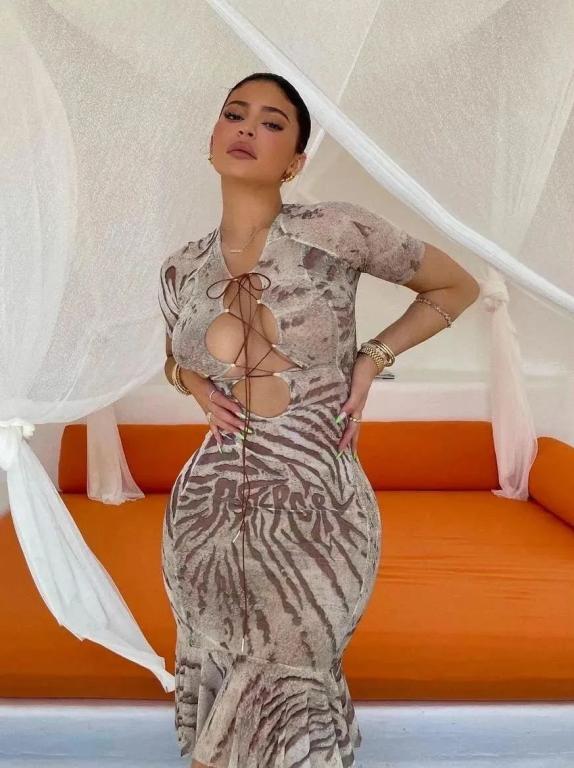 Kylie Jenner上身的这条连衣裙加入了胸前挖空元素,完美展现她性感的S型身材,超显气质!