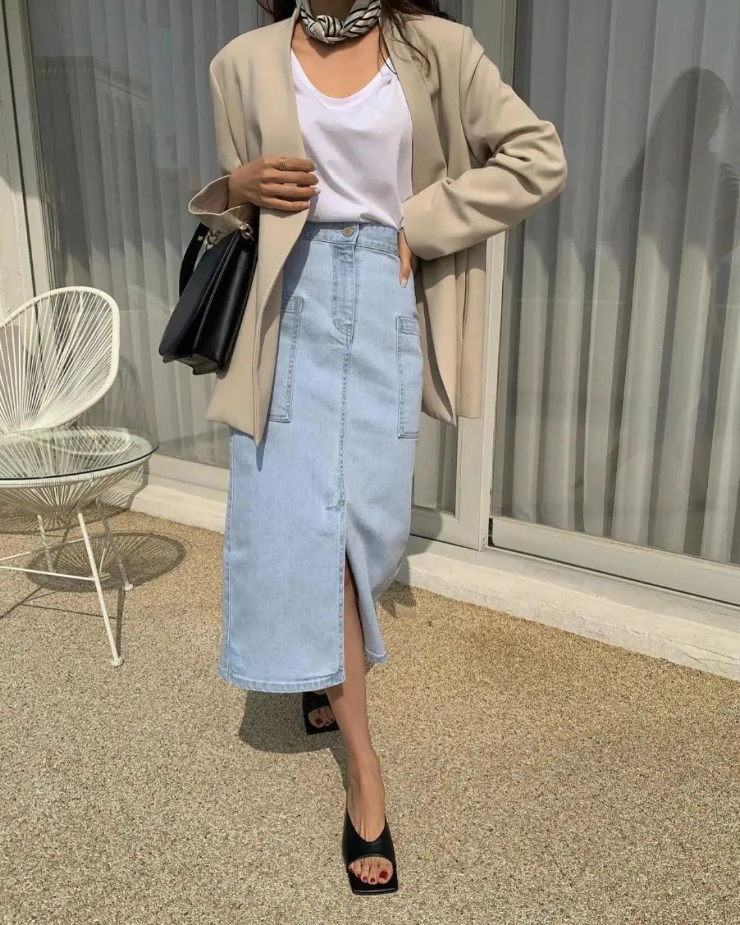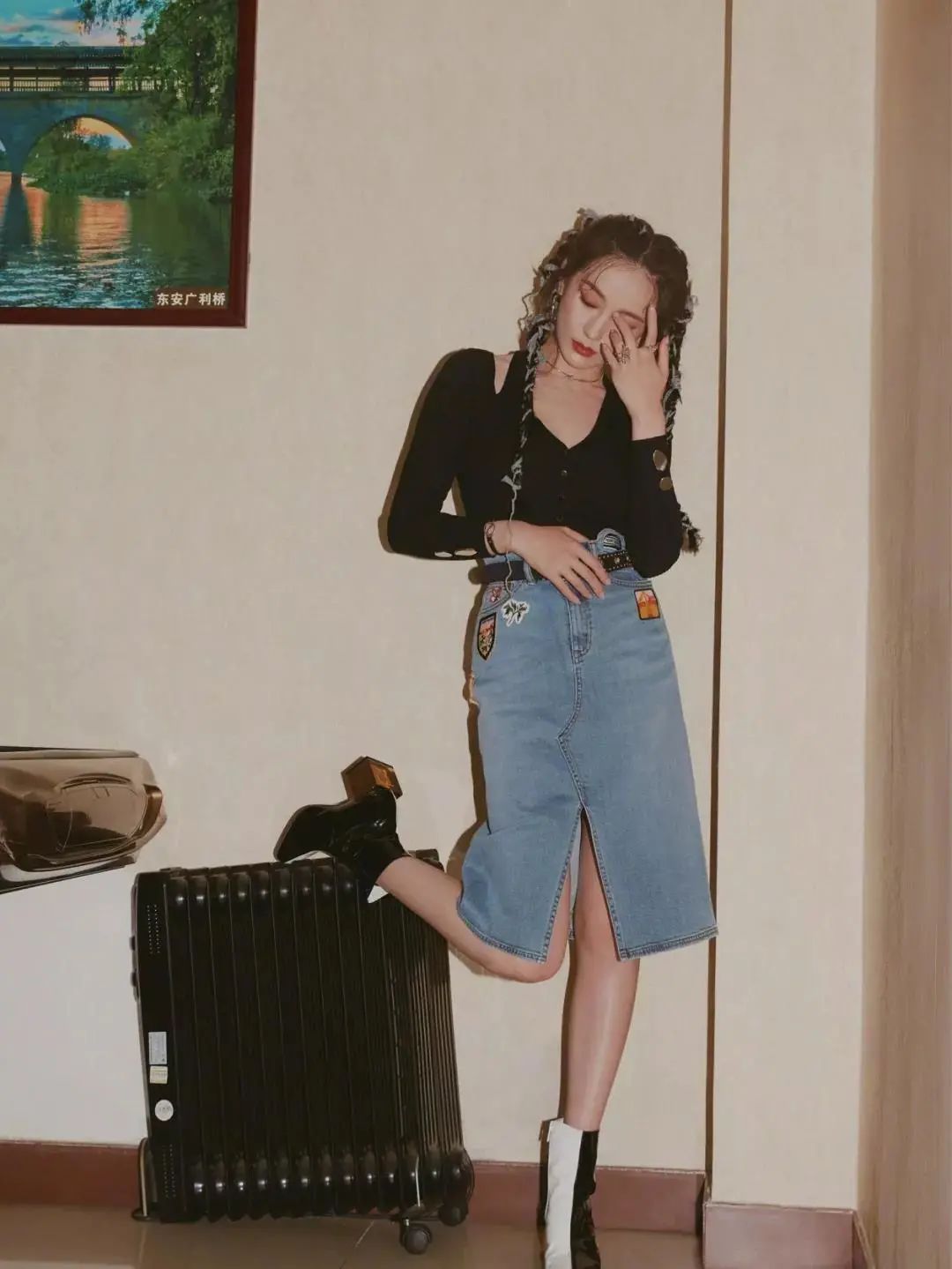 像这样简单经典的丹宁半身裙,只需要稍稍微装饰下上衣,轻轻松松营造出“九头身材”,显高显瘦!